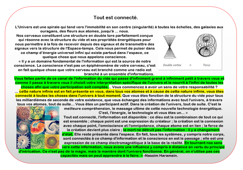 Si tout est connecté, nous aurons alors à concilier le caractère paradoxal de notre nature à la fois finie, déterminée et en même temps nourrie de l'essence qui compose tout l'Univers. Nous aurons à concilier le fini et l'infini, le biologique et la Conscience cosmique, l'humain et le divin, l'entropie et l'éternité de l'information qui ne peut disparaître. Tout est à revoir en privilégiant, si possible, la confiance et la gratitude.