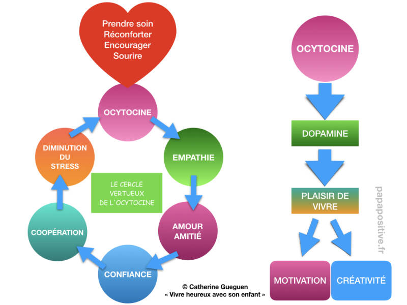 L’ocytocine est également sécrétée sans contact physique lors : d’une relation agréable, d’une interaction harmonieuse, d’une ambiance chaleureuse, d'une conversation agréable, d'un plaisir partagé, d'un simple échange de regards. de l’évocation des êtres que nous aimons...