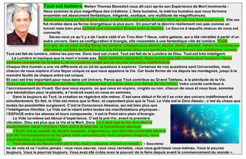 6. Nous échangeons en permanence, à chaque moment, des informations avec le divin à travers la Singularité, les protons, nos cellules, etc. : nous lui en donnons et nous en recevons en retour. L'échange d'information se fait donc en permanence vers l'intérieur et vers l'extérieur à la vitesse de la lumière. Ce champ magnétique définit aussi le fonctionnement de la conscience qui n'est évidemment pas localisée dans le cerveau ; c'est une antenne en connexion avec un champ, et cela se fait notamment via le liquide céphalo-rachidien qui oscille à certaines fréquences.