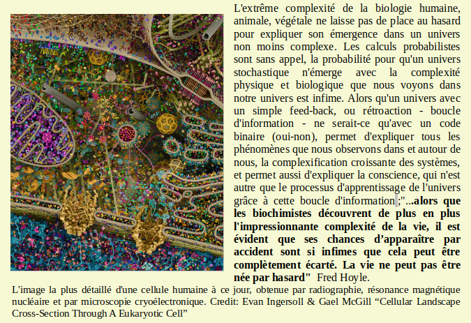 L'Univers n'est pas régit non plus par le hasard ou des lois incontrôlées. L'évolution est orientée vers toujours plus de complexité et de conscience. Elle a d'abord été physique, puis chimique, puis biologique, elle est devenue culturelle et finira sans doute par devenir spirituelle.