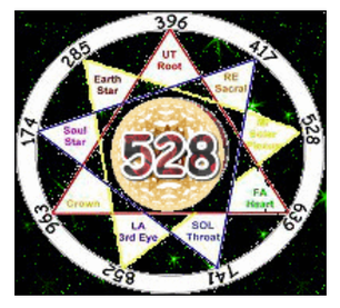 Au centre des triangles : 528 Hz est considérée comme la vibration de l’amour universel. Elle est utilisée par les biochimistes en génétique pour réparer et reprogrammer l’ADN déstructuré. Elle a même permis de dépolluer une partie du Golfe du Mexique.