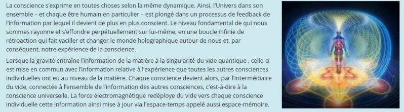 De cette façon, le champ à la base de notre univers, d’où tout provient et où tout retourne, est un réservoir d’information. On peut ainsi concevoir, à travers les processus physiques naturels, comment la conscience (et la conscience de soi en particulier) s’étend au-delà du corps – à travers l’espace et le temps. L’extension par le temps est hautement pertinente, car cela signifierait qu’il existe un mécanisme physique par lequel la conscience de soi unique à chaque individu pourrait exister et survivre au-delà de la dissolution du corps.