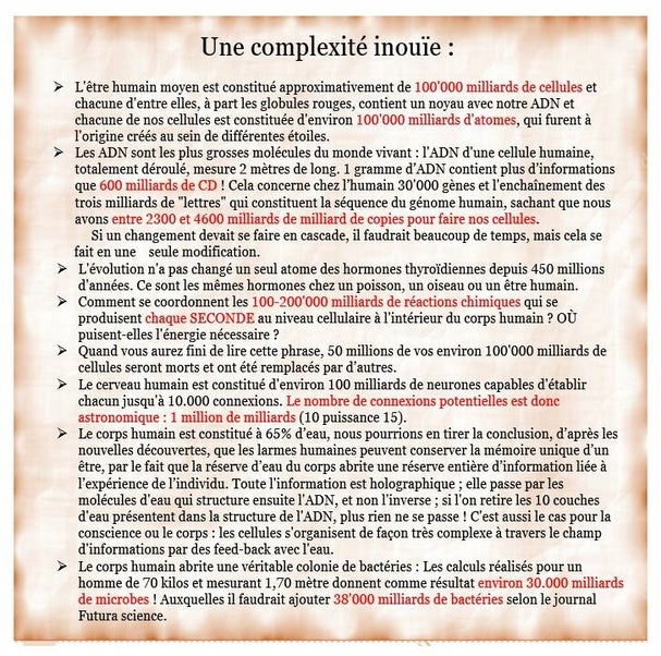 Le champ est composé d’une INFINITE d’échelles (de taille) ; ces échelles sont en résonance fractales et harmoniques. C’est à dire que l’échelle de Planck, puis des protons, puis de nos cellules, du corps, planètes, galaxies, etc. doivent être en résonance harmoniques; l’état d’harmonie ou de disharmonie (résonance harmonique ou non) entre deux types de corps de ce champ (deux échelles ou deux corps de la même échelle) peut être bénéfique ou négatif. L’harmonie/ l’équilibre d’un corps humain (avec ses milliards de cellules et ses milliards d’atomes) est à la fois naturel et fragile, le déséquilibre pouvant provoquer un dysfonctionnement d’un certain type de corps comme les cellules. La communication entre cellules par exemple est extrêmement importante pour entretenir cet équilibre. Ca peut être une anomalie de conscience (croyance fausse) qui déséquilibre l’équilibre chimique-cellulaire de notre biologie. Notre corps, tel un oscillateur biocristal, agit comme un circuit électrocinétique (RLC) analogue à un receveur radio réglé dynamiquement par les biomécanismes.