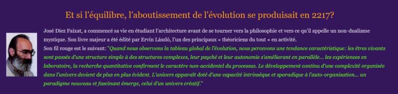 José Díez Faixat peut alors affirmer ceci: le modèle des rythmes que nous avons proposés correspond pleinement à la fois au rythme et au contenu, aux données empiriques des sciences de l’évolution et de l’histoire. Les seize premiers cycles de notre «tableau périodique évolutif » coïncident avec une précision totale avec la totalité des étapes qui se sont produites jusqu’à présent. Il est évident que les cinq cycles restants de cette troisième série marqueront également le modèle de l’accélération vers le grand pic évolutif en quelques siècles, autour de l’année 2217. Le cycle du contenu « écologique» dans lequel nous sommes immergés en ce moment, atteindra son zénith d’ici un siècle, vers l’an 2114. Le cycle suivant, dont l’objectif sera le «désir de réalisation», s’étendra sur la période jusqu’à 2183. Ensuite, le cycle dont le thème central sera « l’amour universel », atteindra son apogée au début du 23ème siècle, vers l’an 2205. Le cycle dont l’objectif sera «l’expression créative », se développera jusqu’en l’an 2213.