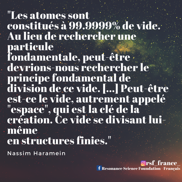 Le travail d'Haramein montre que tout dans l'univers est connecté, de l'échelle la plus grande à la plus petite, grâce à une compréhension unifiée de la gravité. Il démontre que c'est l'espace qui définit la matière et non la matière qui définit l'espace. "Rappelez-vous que la matière est faite de 99,9 % d'espace"- dit Haramein - La théorie du champ quantique expose que la structure même de l'espace-temps, à un niveau extrêmement petit, vibre avec une énorme intensité. Si nous pouvions extraire un infime pourcentage de toute l'énergie contenue au sein des vibrations se trouvant dans l'espace de l'un de vos doigts, cela représenterait assez d'énergie pour alimenter les besoins mondiaux pendant des centaines d'années.